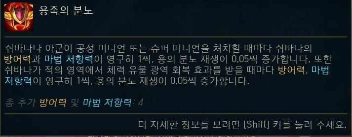 - P(용족의 분노) - 협곡과 패시브가 다르지만 컨셉은 비슷합니다. 쉬바나 포함 아군이 공성 or 대포미니언을 처치하면 분노 재생량이 0.05씩 늘어나는 점이 포인트 입니다.